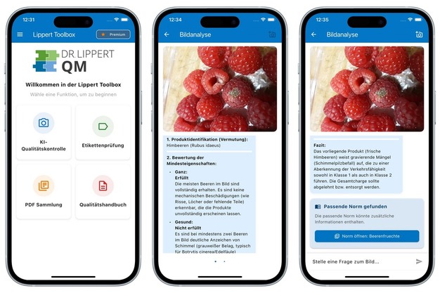 Centraal in de Lippert Toolbox staan twee krachtige, op AI gebaseerde functies. De eerste is AI-beeldanalyse, die een objectieve beoordeling van de productkwaliteit mogelijk maakt op basis van een foto – direct ter plaatse, bijvoorbeeld bij levering of in het veld. "Zichtbare afwijkingen van de minimumkenmerken worden herkend, aangevuld met een geautomatiseerde classificatie en aanwijzingen voor mogelijke gebreken. Dit ondersteunt weloverwogen beslissingen, vermindert subjectieve afwijkingen en bespaart kostbare tijd bij de eerste controle," aldus Philipp Loer, hoofd Research & Development bij Dr. Lippert Qualitymanagement en verantwoordelijk voor de ontwikkeling van de app.