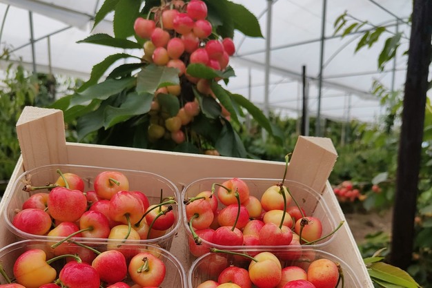 "Bovendien groeien ze natuurlijk beschermd onder kappen, waardoor er geen stof op zit en de kersen prachtig blinken. Ze hebben ook een mooie bestuiving gehad. We waren eerst namelijk bang dat ze niet dik genoeg gingen worden, omdat er zo veel op de bomen hing, maar dat is allemaal zeer goed afgelopen. We hebben een droog voorjaar gehad, met een noordoostenwind, maar in de serres hebben we toch goed kunnen beregenen, waardoor we voldoende vochtige bloesems hebben gehad en de bestuiving goed gelukt is."