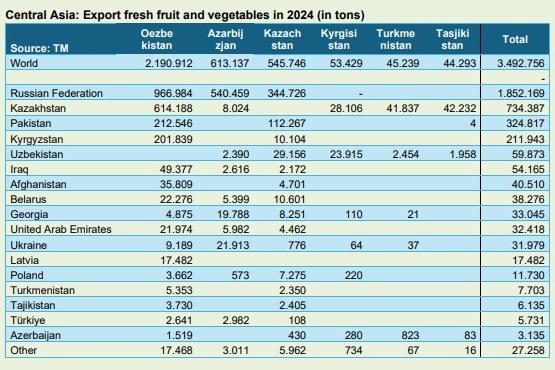 In totaal exporteerden de landen in Centraal-Azië vorig jaar 3,5 miljoen verse groenten en fruit. Met een kleine 0,9 miljoen ton is uien het belangrijkste product. Oezbekistan exporteerde 0,56 miljoen en Kazachstan 0,26 miljoen ton uien. Oezbeekse uien ging vorig jaar vooral naar Pakistan (0,21 miljoen ton) en Kazachstan (0,13). Rusland was goed voor 70.000 ton. Kazachstan exporteerde op z'n beurt vooral uien naar Pakistan en Rusland. Kool is het tweede exportproduct. In totaal exporteerden de landen in Centraal-Azië vorig jaar 0,42 miljoen ton kool waarvan 0,38 miljoen ton door Oezbekistan. Rusland en Kazachstan waren de grote afnemers. Tomaten werden vooral vanuit Azerbeidzjan uitgevoerd. Vorig jaar 145.000 ton. Vrijwel alles hiervan ging naar Rusland. Druiven zijn vooral voor Oezbekistan een belangrijk export product. Vorig jaar ging het om 230.000 ton waarvan 180.000 ton naar Rusland.