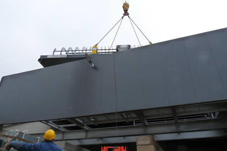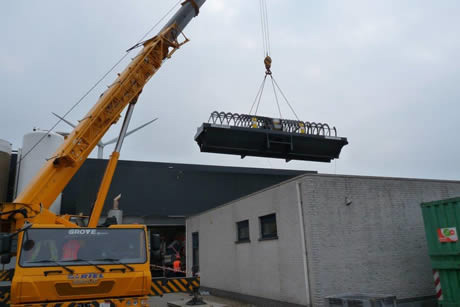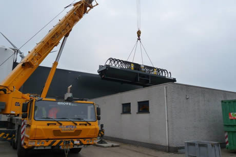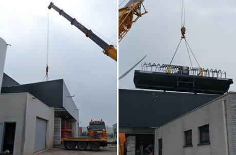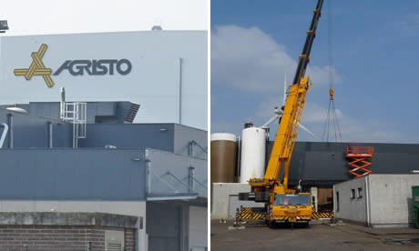 Het complete werk dat zichtbaar is op de foto's, is uitgevoerd tussen dinsdagmiddag 12:00 uur en donderdagavond 18:00 uur. De kraamfirma zorgde ervoor dat het complete werk werd opgetild en in een mum van tijd met meeste perfectie een achttiental meters de hoogte in werd geplaatst", vertelt Bart Verduyn van Barka Services bvba. "De volgende fase is het opnieuw bouwen van het dak boven deze machine, daar deze net iets hoger is dan het gebouw van Agristo. Dit ook voor de vorstvrijheid."