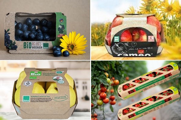 Eerdere toepassingen voor groenten en fruit. Met de klok mee: biologische blauwe bessen, biologische Cameo-appels voor Kaufland, biologische troscherrytomaten voor Lidl Oostenrijk en biologische appels voor Lidl Duitsland