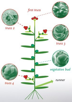 Foto rechts: Aardbeienplant met vier mogelijke trossen