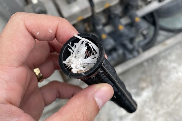 Een andere foto toont een verstopte filter, met als gevolg problemen in de meststoftoevoer.