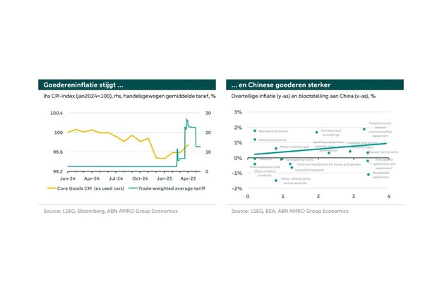 Een van de eerste plaatsen waar het beleid van Trump effect zou moeten hebben, is de prijzen. Maar na hoge cijfers in januari en februari – die nauwelijks aan de regering-Trump kunnen worden toegeschreven – zijn de meest recente gegevens na de invoering van de invoerheffingen gematigd. Laten we voor een beter begrip de belangrijkste punten in de tijdlijn nog eens op een rijtje zetten. China kreeg vanaf februari invoerheffingen van 10%. Op 4 maart kwam daar nog eens 10% bij en Canada en Mexico kregen 25%, wat op 7 maart grotendeels werd teruggedraaid. Op 2 april ('Liberation Day) kregen we 10% universele tarieven. De situatie met China escaleerde verder in het begin van april en bereikte een hoogtepunt op 10 april, waarna het op 14 mei weer werd teruggedraaid. In feite gold in februari een tarief van 10% voor China, dat in maart werd verhoogd tot 20%, en sinds april hebben we hogere tarieven voor China en een algemeen tarief van 10% voor de hele wereld. De data die nu beschikbaar is kan redelijkerwijs alleen de impact van importheffingen op China weergeven.