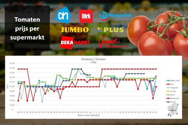 Opvallende situatie in de trostomaten, waar de aanbieding bij Albert Heijn ten einde is, waardoor ze weer 1,35 euro kosten. Dirk verlaagt de prijzen van tomaten, maar bij Hoogvliet en Vomar juist een prijsstijging te zien. Hoogvliet doet 76 eurocent bovenop de prijs (1,35 euro) en Vomar 19 eurocent (1,44 euro).