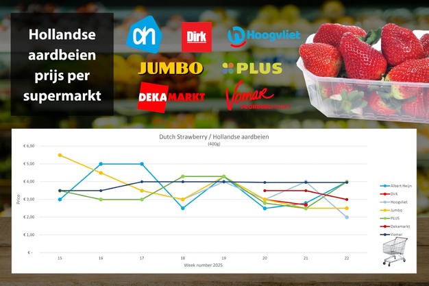 Veel veranderingen in de prijzen voor aardbeien. Zo is de promo bij PLUS ten einde, maar zijn de prijzen wel gelijk verlaagd naar 3,99 euro. Verder zijn de prijzen bij DekaMarkt omhoog gegaan naar 3,99 euro, maar zijn ze voor week 22 in de aanbieding gegaan voor 2,99 euro. Ook Hoogvliet zet de aardbeien in de aanbieding voor 2 euro minder dan de 3,99 euro en de aanbieding bij Albert Heijn is juist afgelopen.