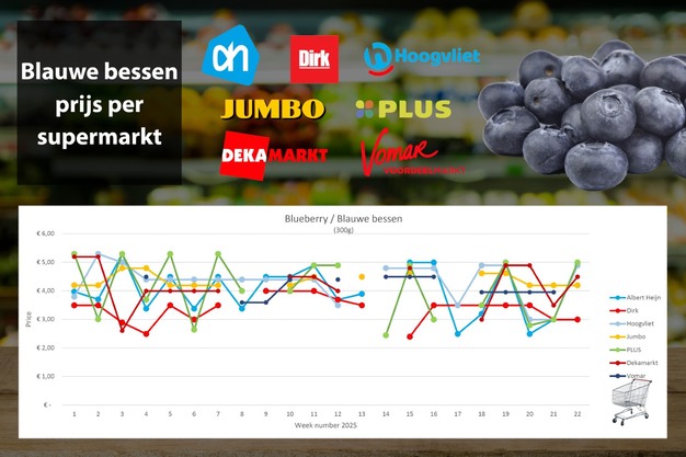 De promo's in de blauwe bessen zijn voorbij bij Hoogvliet en PLUS. Deze zijn weer van 2,99 naar 4,99 euro gegaan. Wel zien we forse prijsstijgingen bij DekaMarkt, waar de blauwe bessen een euro duurder zijn geworden en nu 4,49 kosten. Albert Heijn verlaagt de prijs juist naar 2,99 euro.
