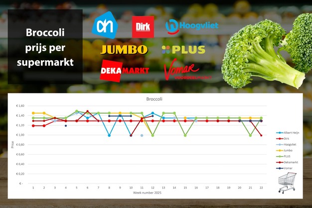 Ook bij de broccoli hebben de supermarkten het rustig aan gedaan. De prijzen in alle supermarkten, op DekaMarkt na, zijn in week 22 hetzelfde gebleven als een week eerder. DekaMarkt heeft 5 eurocent bovenop de prijs gedaan, maar zet vervolgens wel de broccoli in de aanbieding voor 99 eurocent. De aanbieding bij PLUS is voorbij, waardoor de prijs van broccoli daar weer 1,35 euro is.