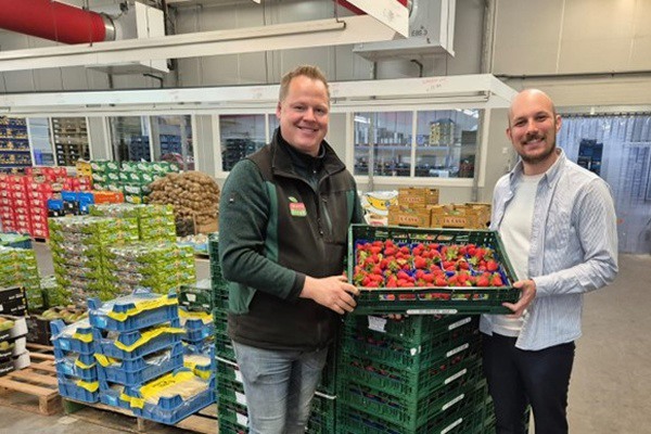 Op de foto links Kevin Geurtjens van Eurofresh rechts en Ashley Borgdorff, verkoper bij The Greenery, met verse Inspire aardbeien.