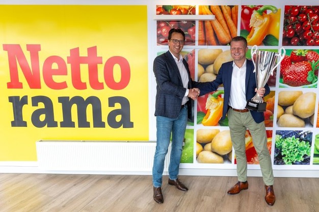 © Supermarkt Kompas, Peter LousMichel Mattheeuws, algemeen directeur van Nettorama, ontvangt uit handen Marco Maatman van 'Supermarktkompas' de prijs voor 'de beste regionale formule'