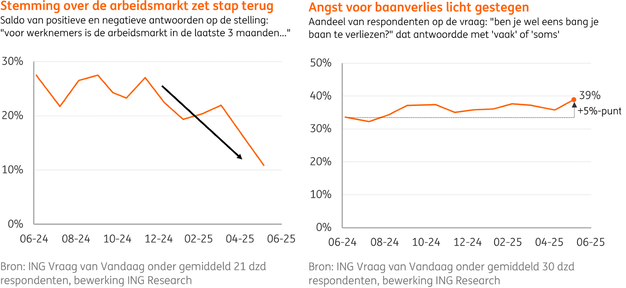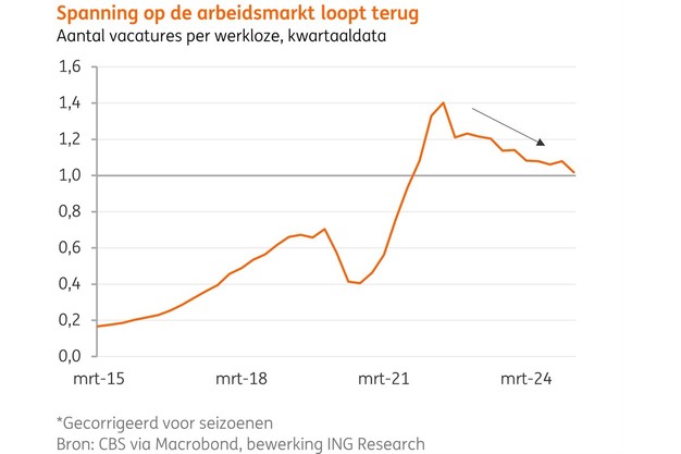 Op de krappe Nederlandse arbeidsmarkt daalt het aantal vacatures gestaag, terwijl het aantal werklozen iets oploopt. Zodoende neemt de spanning op de arbeidsmarkt af. De stemming onder consumenten over de arbeidsmarkt is verslechterd én hun gevoel van baanzekerheid loopt eveneens wat terug, zo blijkt uit onderzoek van ING Research via de ING Vraag van Vandaag. Dit kan ervoor zorgen dat huishoudens hun uitgaven temperen.