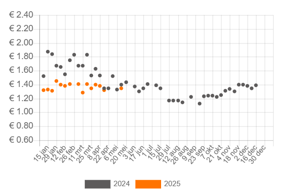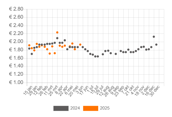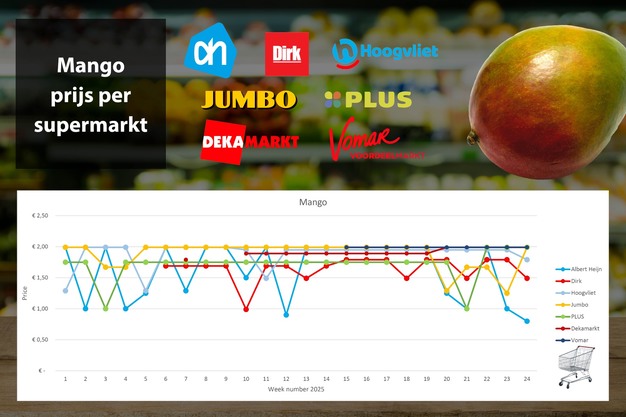 De mangoprijs blijft sprongen maken en dat is anders dan vorig jaar zoals te zien is in de onderstaande grafiek met de prijsgeschiedenis van het product. In week 24 van 2025 verlaagt Albert Heijn de prijs verder met 20 cent naar 80 cent per stuk wanneer klanten twee stuks kopen. Dirk heeft ook een aanbieding, de aanbieding van Jumbo is voorbij.
