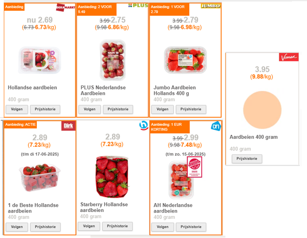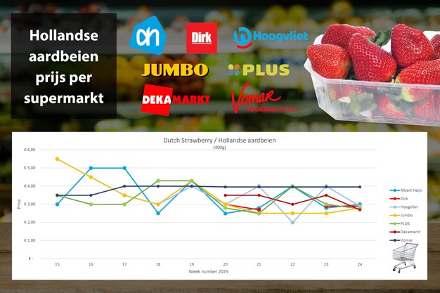 Doorlopende promoties maken dat de aardbeienprijs in week 24 daalt, bij bijna alle onderzochte supermarkten ligt de prijs inmiddels onder de 3 euro. Vomar is een duidelijke uitzondering. DekaMarkt is met 2,69 euro per 400 gram de voordeligste.
