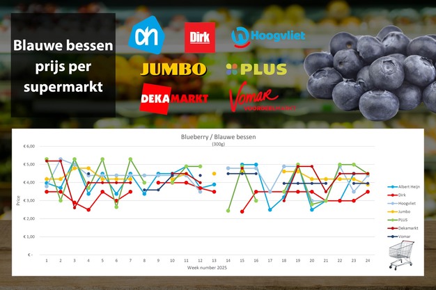 Prijzen voor blauwe bessen komen dichter bij elkaar te liggen. Het verschil tussen de duurste en de goedkoopste optie is echter nog altijd een euro. Zowel Jumbo (van 4,19 euro voor 3, 89 euro) als Plus (4,99 voor 4,49) hebben in week 24 blauwe bessen in de aanbieding, Dirk blijft met 3,49 euro per 300 gram nog altijd het goedkoopst.