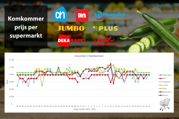 De vaste prijzen voor komkommer blijven tussen de 79 - 85 cent per stuk liggen. Na de aanbieding in week 23 verlaagt Hoogvliet de vaste prijs ook naar 79 cent. Supermarkten Albert Heijn, Jumbo en Plus houden de prijs op 85 cent. Dirk maakt in komkommer geen prijsverschil.