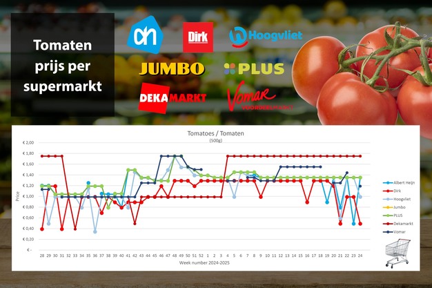 Sinds week 19 zijn er telkens stunts in losse trostomaten 500g waarbij Hoogvliet, Albert Heijn en Dirk elkaar afwisselen. In week 24 neemt Dirk het stokje over van Albert Heijn en biedt losse trostomaten aan voor 49 cent per 500 g. Plus en DekaMarkt houden de prijzen stabiel. Bij Vomar zijn trostomaten met regelmaat niet online beschikbaar.
