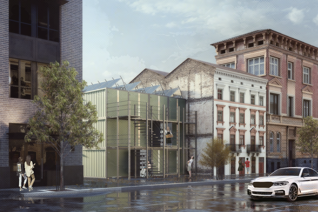 Een buitenmodel van het modulaire teeltbedrijf van Take Root Bio Technologies