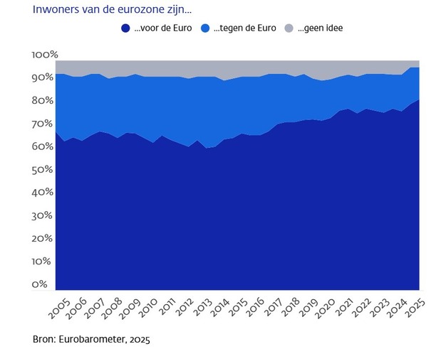 In de hele eurozone zijn ruim 8 van de 10 mensen voorstander van de euro. In 2011, na de financiële crisis en tijdens de daaropvolgende eurocrisis, stond het vertrouwen in de euro onder druk. Dat kwam onder andere door stijgende overheidsschulden. Toentertijd hadden maar 6 van de 10 mensen een positieve mening over de euro. Sindsdien heeft de Europese economie verschillende crises doorstaan, zoals de Brexit, de coronacrisis, de oorlog in Oekraïne en de sterke stijging van de inflatie. Hierdoor is het vertrouwen in de euro toegenomen.