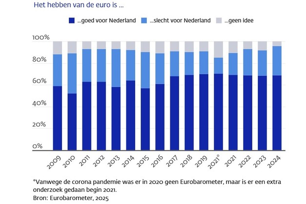Ook in Nederland is het vertrouwen in de euro al lange tijd groot. Uit het laatste onderzoek blijkt dat bijna 7 op de 10 mensen in Nederland de euro goed vinden voor ons land. Dat is iets lager dan het gemiddelde in de eurozone, hoewel het verschil klein is. De steun in Nederland dipte rond de financiële crisis, maar heeft zich sindsdien hersteld.