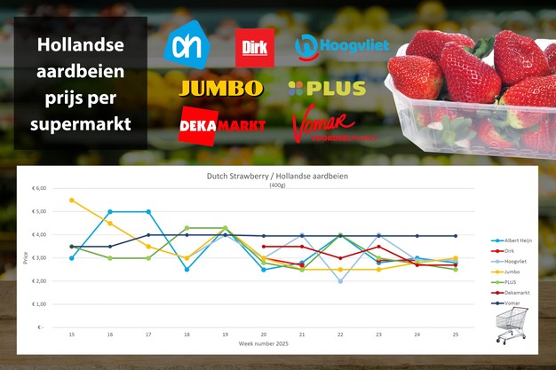 Albert Heijn en Plus zakken wederom met de prijs voor een bakje aardbeien, respectievelijk komen deze uit op 2,79 euro en 2,50 euro per 400 gram (in de aanbieding). Jumbo verhoogt de prijs juist met 20 cent, naar 2,99 euro, maar ook daar blijven aardbeien in de aanbieding. Opvallend is dat Dirk zich in aardbeien niet onderscheidt met aanbiedingen voor aardbeien, en ook niet op laagste prijs (2,89 euro). Deze 'titel' kan in week 25 naar DekaMarkt die aardbeien net als vorige week voor 2,69 euro aanbiedt. Vomar valt op met de hoogste prijs: 3,95 euro.