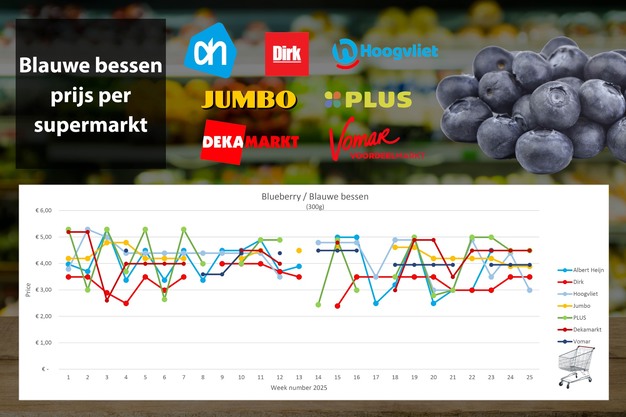 Vorige week bleek dat de blauwe bessenprijzen naar elkaar toe bewogen. In week 25 blijven de prijzen op niveau. Echter is er bij Hoogvliet ruimte voor een flinke aanbieding, waar blauwe bessen in week 25 van 4,39 euro voor 2,99 euro in het onlineschap liggen.
