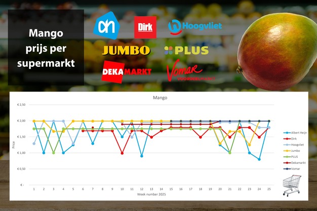 De aanbiedingen van mango bij Albert Heijn en Dirk zijn voorbij en de prijzen veren terug naar het oude niveau. Mango's bij Dirk en Hoogvliet hebben de laagste prijs, namelijk 1,79 euro per stuk. De andere supermarkten houden het op net geen 2 euro per stuk.