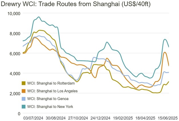 Volgens Drewry's Container Forecaster zal de balans tussen vraag en aanbod in de tweede helft van 2025 naar verwachting opnieuw onder druk komen te staan, wat zal leiden tot een daling van de spotprijzen. De volatiliteit en timing van tariefwijzigingen zullen afhangen van de resultaten van juridische procedures tegen de Trump-tarieven en van capaciteitsveranderingen in samenhang met nieuwe Amerikaanse sancties op Chinese schepen, waarvan de uitkomsten nog onzeker zijn.