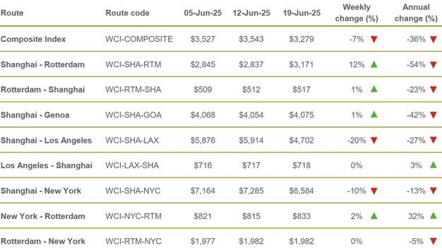 De vrachttarieven van Shanghai naar New York zijn de afgelopen week met 10% gedaald tot $6.584 (afhankelijk van de dagelijkse wisselkoers) per 40ft container. Ondanks deze daling liggen de spotprijzen nog steeds 81% hoger dan zes weken geleden (8 mei), terwijl de tarieven naar Los Angeles de afgelopen week met 20% zijn gedaald, maar over de afgelopen zes weken met 73% zijn toegenomen.