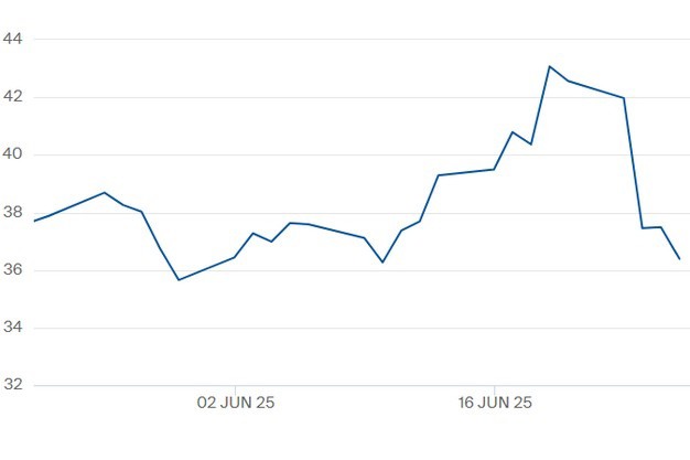 De TTF-gasprijs voor het contract 'winter 2025' t/m 26 juni. Klik hier voor de actuele gascontractprijzen.