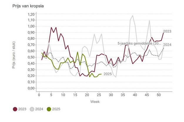 De prijsvorming voor kropsla kent voorlopig weinig verbetering en blijft volgens Boerenbond erg zwak rond 0,25 euro/stuk hangen. Dat geldt evenzeer voor slasoorten zoals Bionda. Begin juni kende de aardbeienmarkt een prijspiek, maar de prijzen zakten naar een middenprijs rond de 4,30 euro/kg.