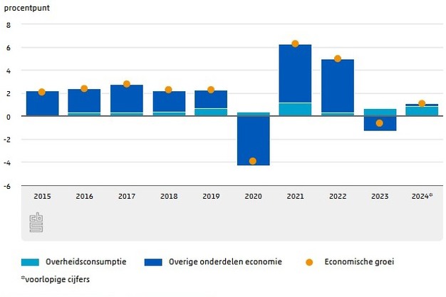 In 2024 was de consumptie door de overheid de belangrijkste bron van economische groei. De Nederlandse economie groeide met 1,1 procent. De overheidsconsumptie droeg hier 0,9 procentpunt aan bij. De overige 0,2 procentpunt kwam door consumptie van huishoudens, export en investeringen. In 2023 kromp de economie, maar groeide de overheidsconsumptie nog wel. Zonder die groei was de economische krimp groter uitgevallen. Dit blijkt uit cijfers van het CBS.