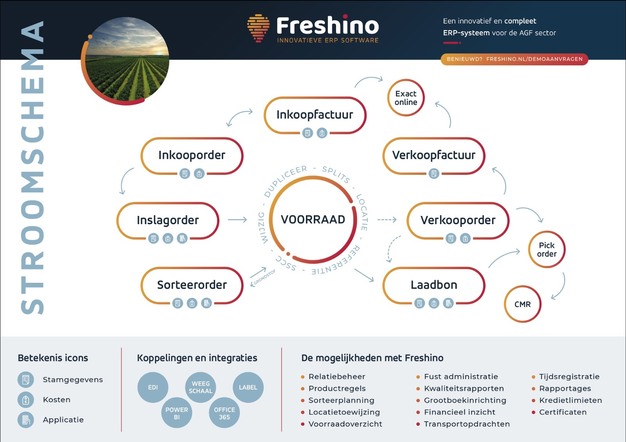 Freshino biedt inzicht in alle bedrijfsprocessen van een AGF-onderneming, van de inkoop of oogst, tot voorraadbeheer, verpakking, verzending, verkoop en facturatie. "Door informatie over elke stap in de keten in het ERP-systeem toe te voegen, van het uploaden van inkooporders en transportdocumenten tot het scannen van etiketten en het verzenden van de factuur, heeft een teler of handelaar de volledige track-and-trace van een partij groenten of fruit inzichtelijk, en dit zelfs op schaaltjesniveau," vertelt Henk Jan. "Ook alle belangrijke randinformatie, zoals gegevens die verband houden met de kwaliteitscontrole, bewaring of houdbaarheid, zijn terug te vinden in Freshino."