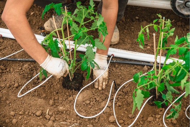 Het instellen van irrigatie in de kas (l) en het oogsten van komkommers