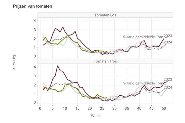 De middenprijs voor trostomaten in week 27 komt uit op 61 eurocent per kilo. Voor losse tomaten komt de prijs uit op 65,3 eurocent.