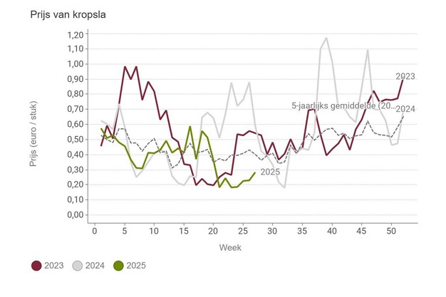 Voor die andere saladagroente uit de serre, kropsla, is de prijsvorming nog altijd moeizaam. Sinds halverwege mei liggen de prijzen hier al ruim onder het vijfjarig gemiddelde en blijven ze ook achter bij de prijzen van de afgelopen twee jaar. De prijzen voor diverse andere slasoorten verbeterden in week 27 wel, waaronder ook Lollo Bionda uit de serre. Per stuk is in week 27 43,2 eurocent betaald. In week 26 was dat nog 27 eurocent.