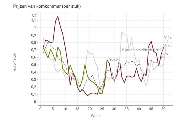 De gemiddelde stuksprijs voor komkommer komt voor week 27 uit op 57,2 eurocent. In week 24 en 25 lagen de prijzen nog heel erg laag. Bij prijzen van slechts 11 eurocent per stuk weinig er te verdienen voor telers, die wel hoge producties haalden.