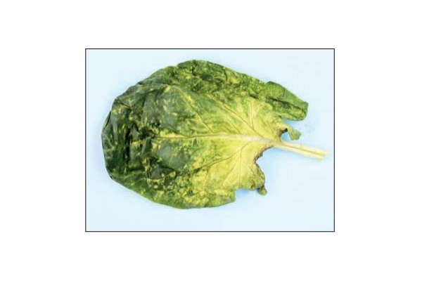 Spinazieblad met virussymptomen, hier werd PhCMoV in gevonden. Dat spinazie hier een waardplant voor is, was nog niet gepubliceerd. In Belgiƫ bleek dit virus al eerder gevonden te zijn in spinazie.