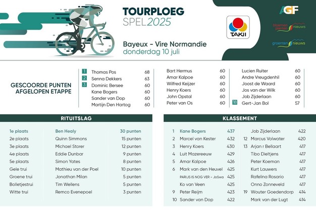 In het Takii Tourploegspel ging de dagwinst donderdag naar Thomas Pos van FruitPro. Kane Bogers van APB Holland, het supplementenbedrijf bij ons in Tholen op kantoor, neemt de gele trui over van Marcel van Kester en gaat nu aan de leiding.