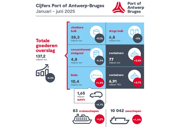 In de eerste zes maanden van 2025 behandelde Port of Antwerp-Bruges 137,2 miljoen ton maritieme goederen, een daling van 4,3% ten opzichte van dezelfde periode vorig jaar. Terwijl de trafiek van containers en RoRo groeide, noteerden droge en vloeibare bulk een daling. De congestie op de terminals, veroorzaakt door een samenspel van logistieke uitdagingen en marktontwikkelingen, blijft voelbaar, zoals in heel Noordwest-Europa. Opvallend is de verdere toename van het handelsverkeer met de Verenigde Staten, die de sterke positie van Port of Antwerp-Bruges op de trans-Atlantische routes bevestigt.