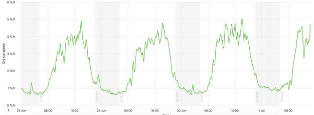 Binnenkort komt Growficient met een nieuwe feature om nog beter te kunnen sturen. Dennis: "We geven op het Growboard al inzicht in intering. Daarmee zie je hoeveel procent het watergehalte is gezakt tussen twee beurten in. Binnenkort komt daar de interingssnelheid bij. Hierin zie je in realtime hoe snel de intering gaat, zodat je kunt voorspellen wanneer je de volgende waterbeurt moet inplannen. Dat helpt om je watergehalte en de EC-waarde stabiel te houden."
