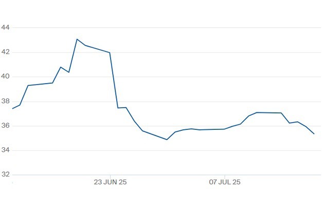 De TTF-gasprijs voor het contract 'winter 2025' t/m 18 juli. Klik hier voor de actuele gascontractprijzen.