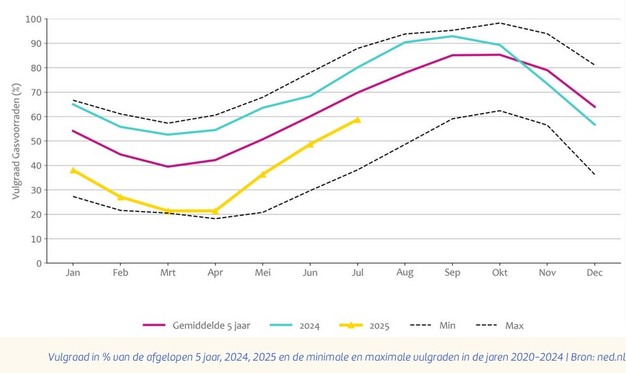 De hernieuwbare energiebronnen wind op zee, wind op land en zon waren in Nederland in juli 2025 samen goed voor 53% van de totale elektriciteitsproductie. In juli 2024 was dat 58%, zo valt te lezen op het Nationaal Energie Dashboard. Op het dashboard wordt ook de gasvoorraad in Nederland bijgehouden. Eind juli lag de vulgraad op 59%, minder dan vorig jaar en het vijfjarig gemiddelde.