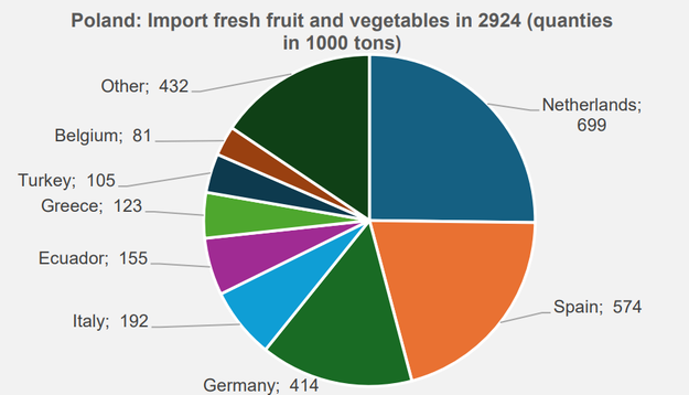 Polen importeert verse groenten en fruit veel uit/via Nederland. Vorig jaar werd er 700.000 ton uit/via Nederland ingevoerd. Dat was meer dan in 2023, maar minder dan in 2022. Er zijn drie producten met een import uit Nederland in 2024 groter dan 100.000 ton, te weten uien, bananen en tomaten. Op afstand (met elk 20 tot 30.000 ton) volgen druiven, sinaasappelen, peen, avocado's en peren. Producten met een import van iets minder dan 20.000 ton zijn paprika's, citroenen, mandarijnen en watermeloenen.