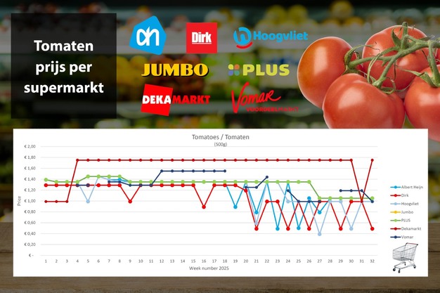 De tomatenprijzen blijven bij de meeste supermarkten rond de 1 euro hangen. Alleen DekaMarkt heeft, na de forse prijsdaling in week 31, besloten de prijzen weer naar 1,75 euro te trekken. Verder zet Dirk de tomaten deze week in de aanbieding voor 49 eurocent.