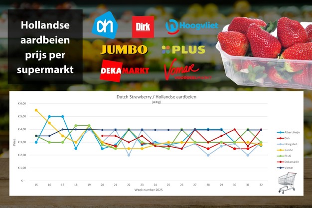 Ook de aardbeiprijzen blijven relatief stabiel in de zomerweken. Albert Heijn, Jumbo en Plus houden de prijzen op 3,99 euro. Ook DekaMarkt is gestegen naar 3,99 euro. Dirk en Hoogvliet blijven een euro onder deze prijs zitten. Voor week 32 hebben Albert Heijn en Jumbo echter besloten de aardbeien in de aanbieding te zetten voor respectievelijk 2,74 en 2,79 euro.