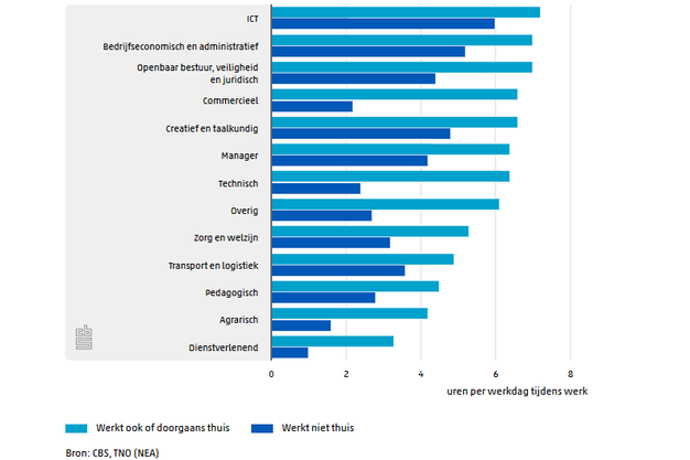 Verschillen in zituren tijdens werk tussen thuiswerkers en niet-thuiswerkers zijn het grootst in dienstverlenende beroepen en commerciële beroepen: thuiswerkers zitten ruim drie keer zoveel als collega's die altijd op locatie werken. Zo zitten thuiswerkers met een dienstverlenend beroep gemiddeld 3,3 uur per werkdag, tegen 1,0 uur voor niet-thuiswerkers. In commerciële beroepen zitten thuiswerkers gemiddeld 6,6 uur, terwijl niet-thuiswerkers gemiddeld 2,2 uur zitten per werkdag. In ICT-, bedrijfseconomische en administratieve beroepen is dit verschil minder groot: daar liggen de zituren van thuiswerkers en niet-thuiswerkers dichter bij elkaar.