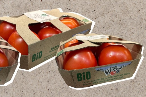 Vanaf nu worden Zwitserse biologische tomaten bij Lidl aangeboden in een verpakking die tot 35% is gemaakt van silphiumvezels.