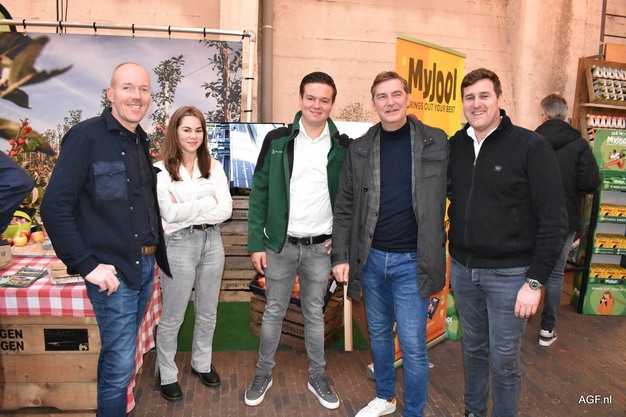 Evert Pross en Richard van der Helm (Willem Dijk AGF) en Aart Bezemer (Aartsen) met Rick en Luna van Van Ossenbruggen Fruit op de AGF-beurs Zuid-Nederland.