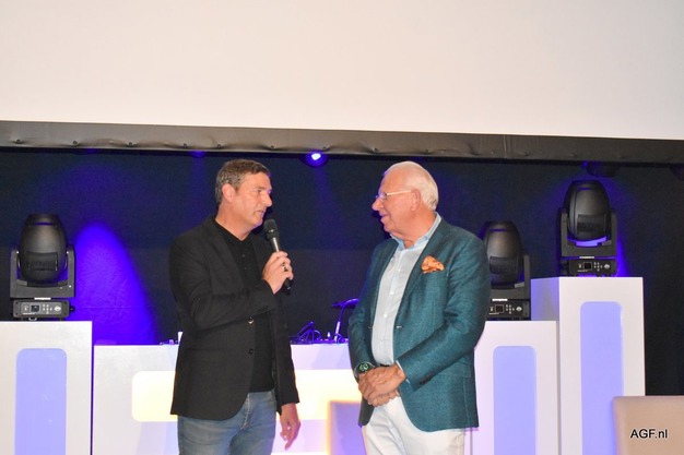 Richard van der Helm feliciteert Willem Dijk met het 25-jarig bestaan van Groothandel Willem Dijk AGF.