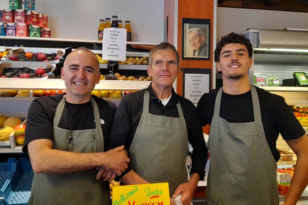 © Marjet Lubbers-Bruijnse | GroentenNieuws.nlDe nieuwe eigenaar Murat en oude eigenaar John, samen met vaste medewerker Stijn. Op de achtergrond een foto van Ben Vork